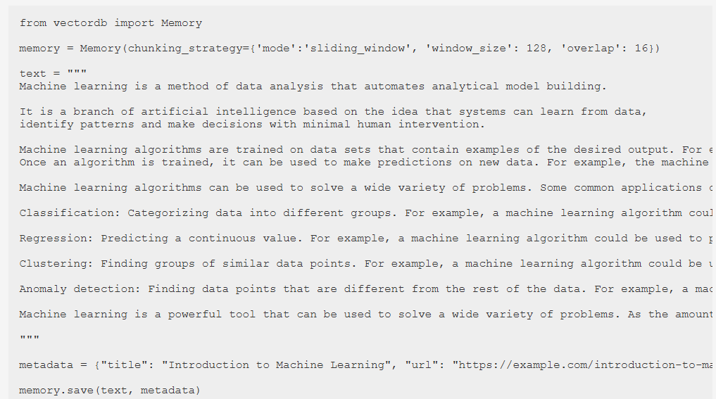 VectorDB is a lightweight Python package for storing and retrieving text using chunking, embedding, and vector search techniques. It provides an easy-to-use interface for saving, searching, and managing textual data with associated metadata and is designed for use cases where low latency is essential. Vector search and embeddings are essential when working with large language models because they enable efficient and accurate retrieval of relevant information from massive datasets. By converting text into high-dimensional vectors, these techniques allow for quick comparisons and searches, even when dealing with millions of documents. This makes it possible to find the most relevant results in a fraction of the time it would take using traditional text-based search methods. Additionally, embeddings capture the semantic meaning of the text, which helps improve the quality of the search results and enables more advanced natural language processing tasks.