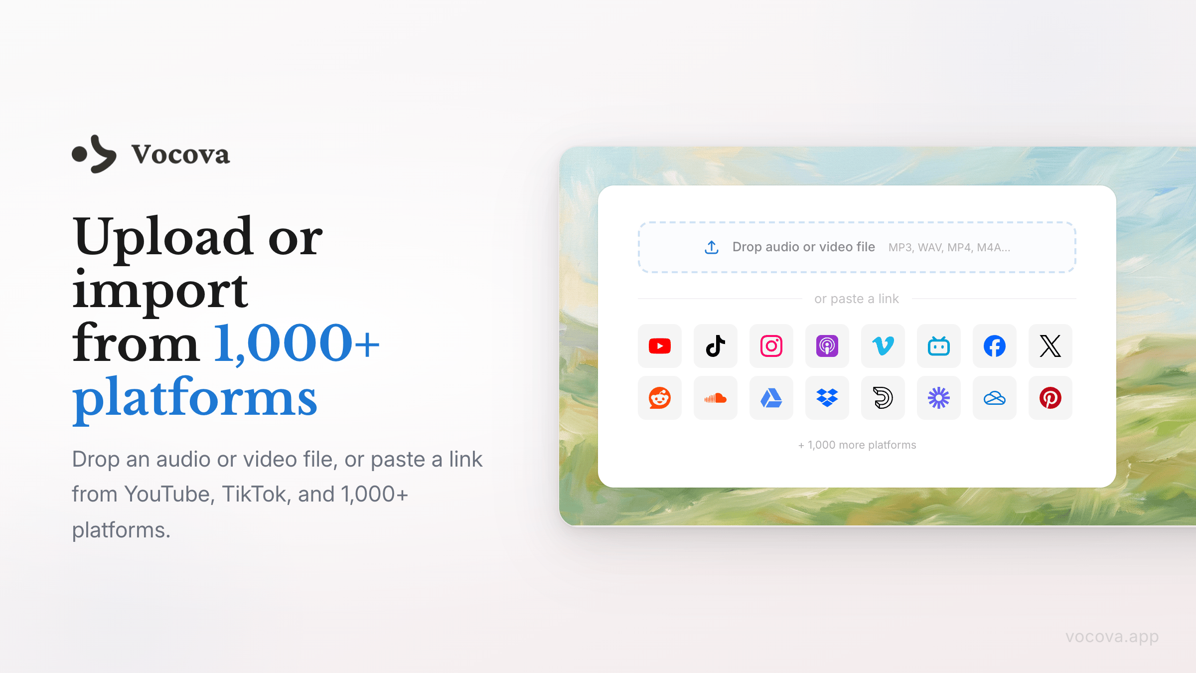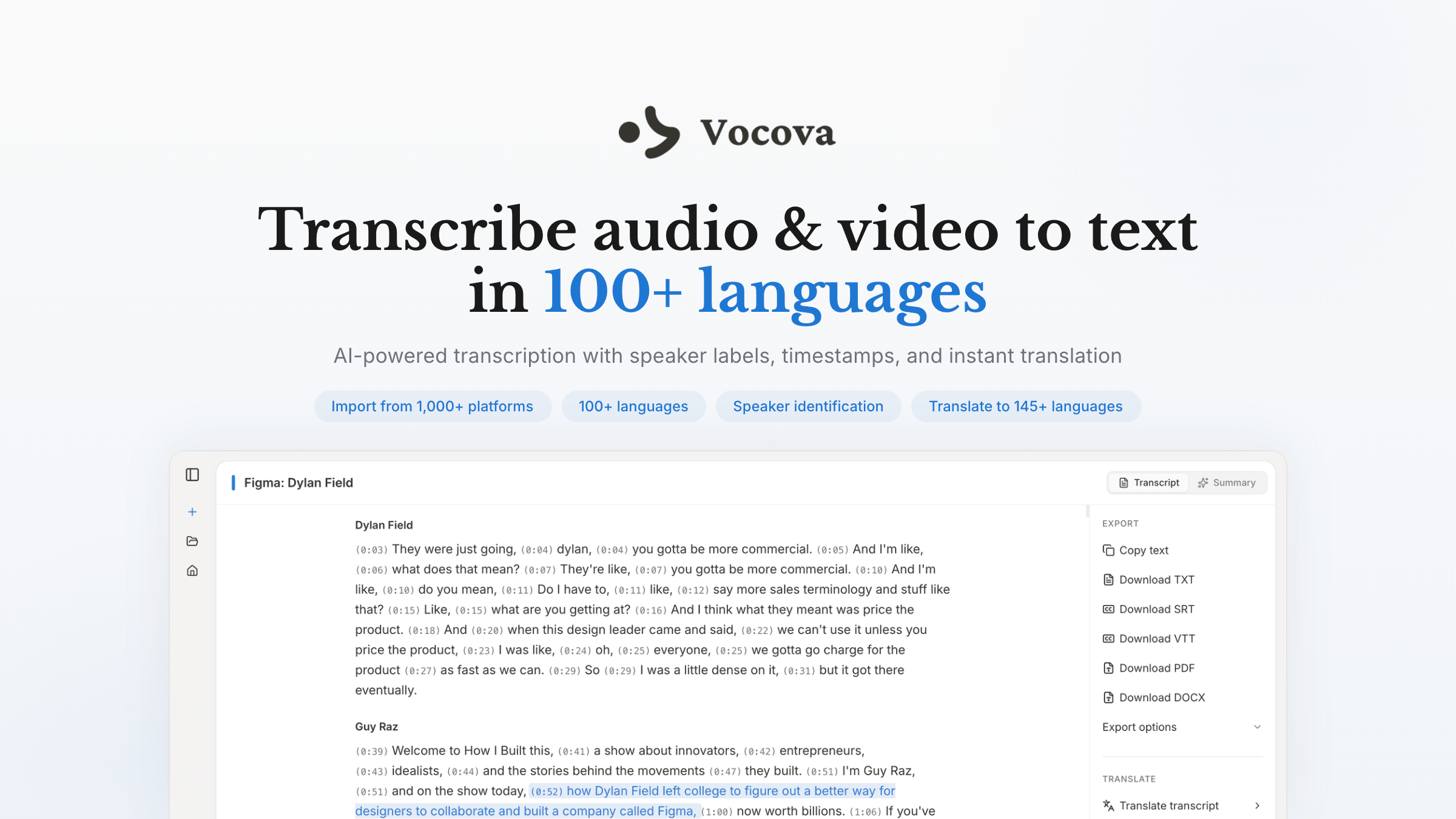Vocova is an AI-powered transcription tool that converts audio and video to text in 100+ languages. Upload a file or paste a link from YouTube, TikTok, Zoom, Google Meet, and 1,000+ platforms.