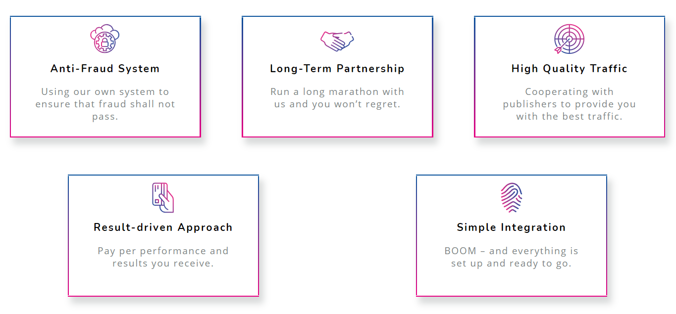 - Exceptional traffic quality and purity ensured by the latest anti-fraud software