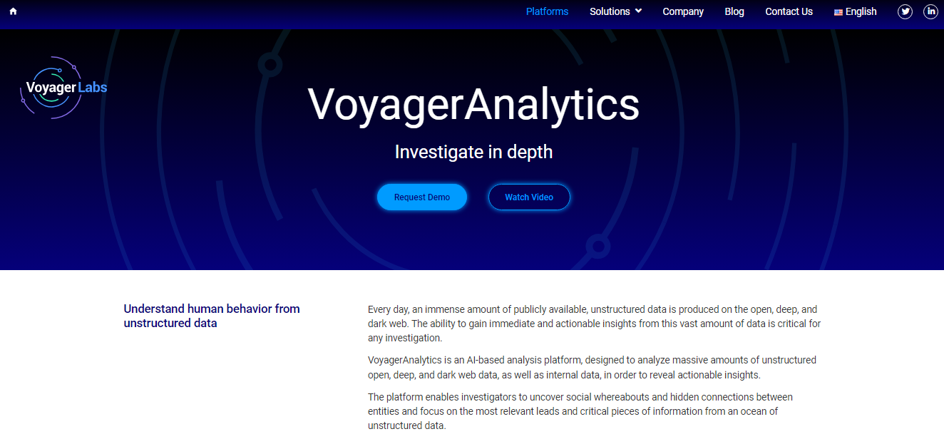 Every day, an immense amount of publicly available, unstructured data is produced on the open, deep, and dark web. The ability to gain immediate and actionable insights from this vast amount of data is critical for any investigation. VoyagerAnalytics is an AI-based analysis platform, designed to analyze massive amounts of unstructured open, deep, and dark web data, as well as internal data, in order to reveal actionable insights. The platform enables investigators to uncover social whereabouts and hidden connections between entities and focus on the most relevant leads and critical pieces of information from an ocean of unstructured data. Simplify data gathering, analysis and smart visualization that would take months to handle. It presents the most relevant and important information in near real-time, saving resources normally spent retrieving, processing, and analyzing vast amounts of unstructured data.