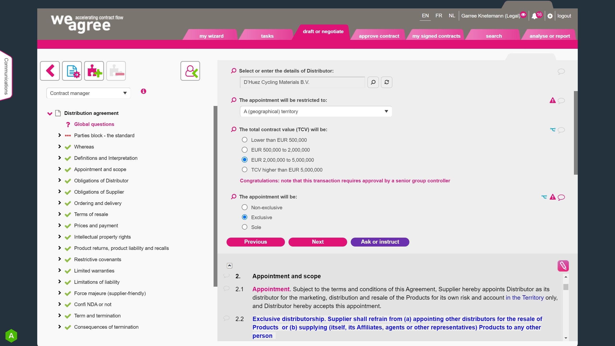 Contra is an Agile Contract Lifecycle Management (CLM) and Document Automation Software designed to facilitate and speed up the generation and execution of all contracts. With Contra, any department, in any company, in any industry, can seamlessly draft, edit, redline, and collaborate on contracts, including; auto-generating legal documents from templates, designing approval centres, working with external collaborators and advisors, and even e-signing, tracking, and storing in a central searchable repository.