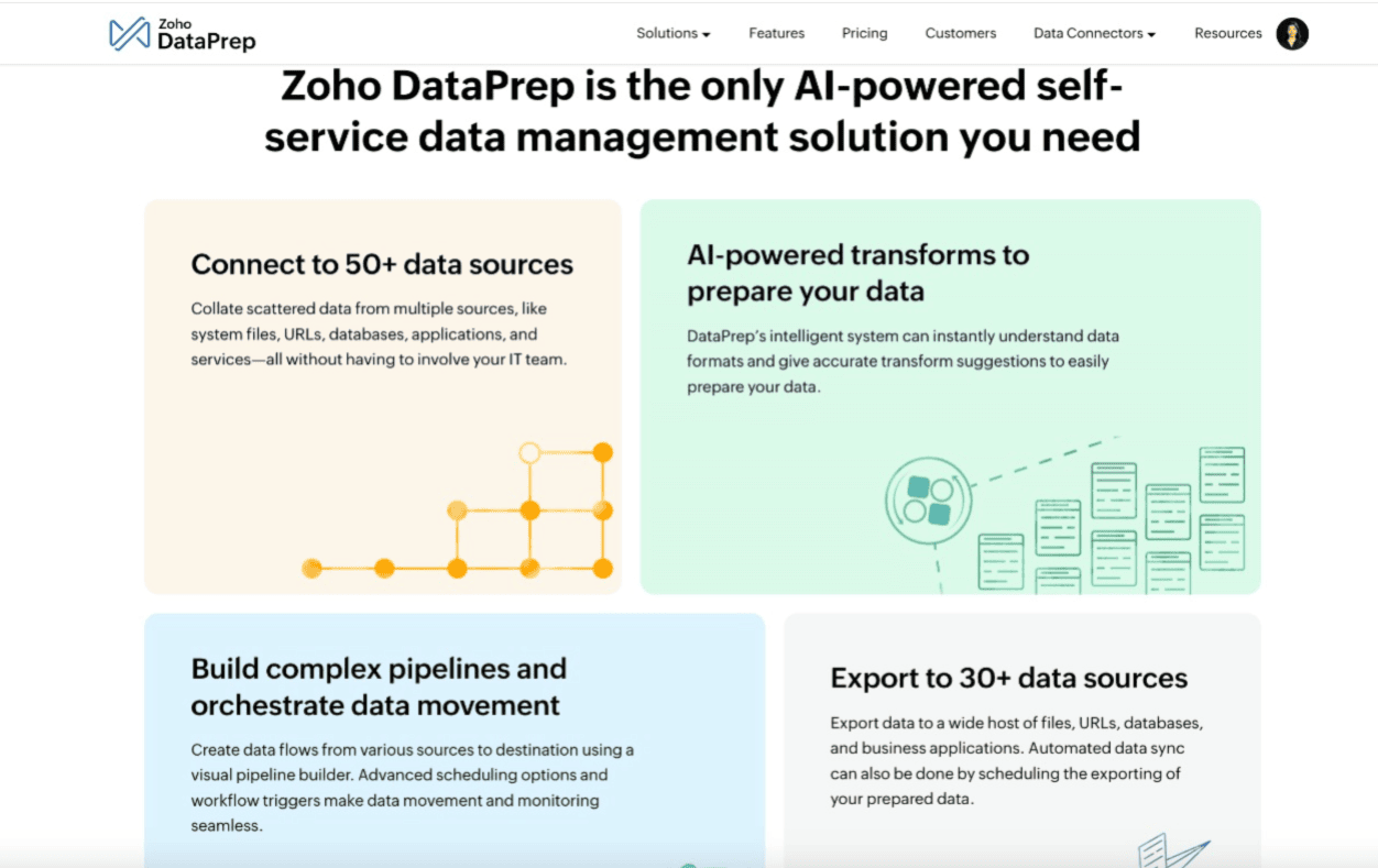 Zoho DataPrep (Best ETL tool in 2025) is an AI-powered, advanced self-service data preparation software that helps organisations prepare large volumes of data.
