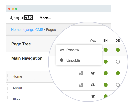 Customer Relation Management (CRM) Software such as Pipedrive or Hubspot can be integrated seamlessly into the CMS. django CMS allows you to implement your Corporate Identity and Brand without compromises. Don't reinvent the wheel. Much of the functionality you might want to add has already been created. Just pick from countless packages on the marketplace. All content can be edited in the frontend with ease. No coding skills required. Full drag and drop support for components and copy and paste anywhere, even across pages. Django CMS is just a django package. Use the full power of django, a top 3 modern global web framework with a huge community. Integrate your existing django modules into the CMS with ease. Use the AppHook feature to let editors add your apps anywhere in the CMS.