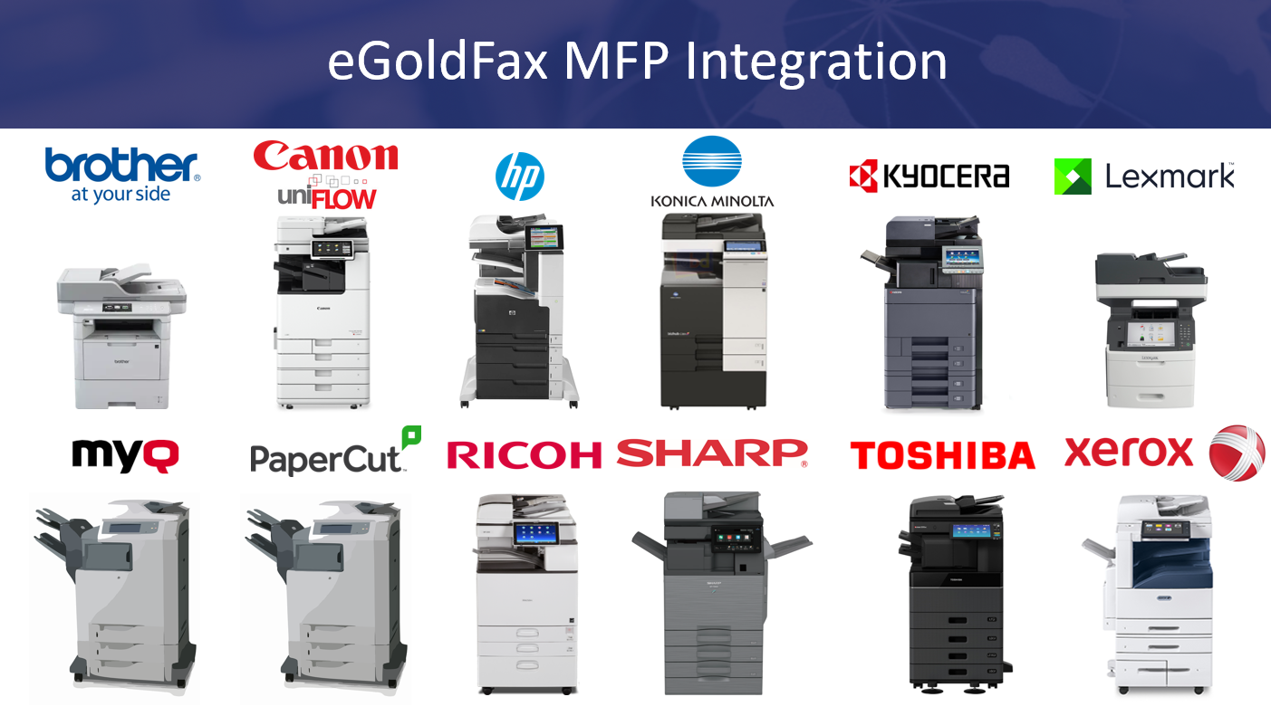 eGoldFax has forged partnerships with renowned Multi-Function Product providers, solidifying its position as a leading fax solution. By collaborating with industry giants such as Sharp, Kyocera, Xerox, Konica Minolta, Canon, HP, Ricoh, Lexmark, and more, eGoldFax ensures seamless integration with a wide range of MFPs.