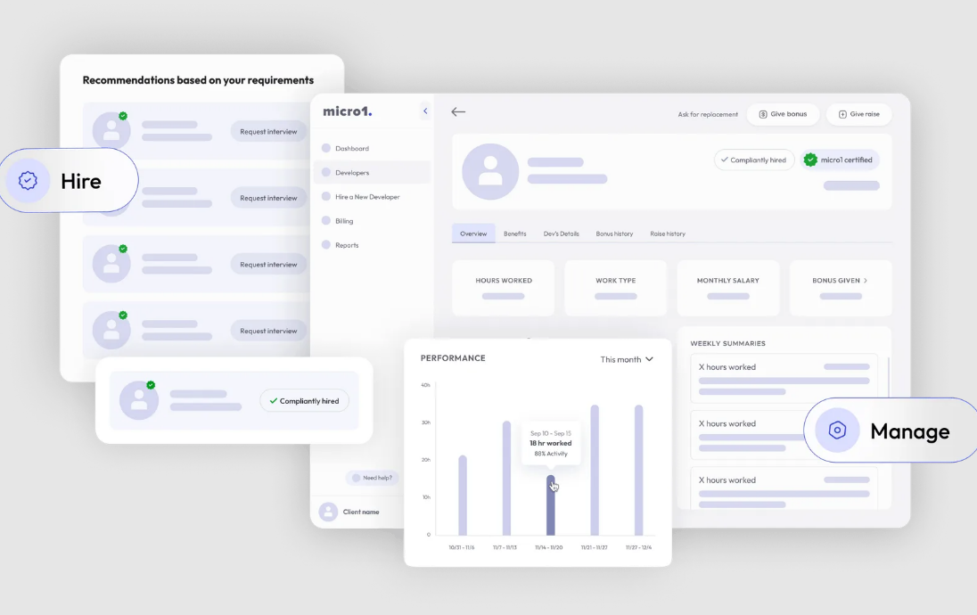 At micro1, we help companies hire the best remote software engineers easily. When you hire with us, you don't have to worry about finding top 1% talent, international employment laws, or benefits. We also have a 1-week free trial per developer. Once you've hired a top 1% engineer, you can use our platform to manage the talent. You can send bonuses, track hours, give raises, and much more. Work is now remote 1st, companies will be at a large disadvantage if they limit their engineering team to a commuting radius around a specific location. The engineer will be in direct contact with you and your company. You can also add the engineer to all of your company channels and software. However, you will not be directly hiring the developer, you will be hiring micro1. Hiring micro1 builds a layer of abstraction for the legal, compliance, global pay and benefits.
