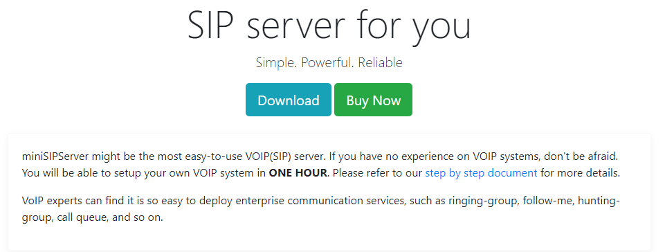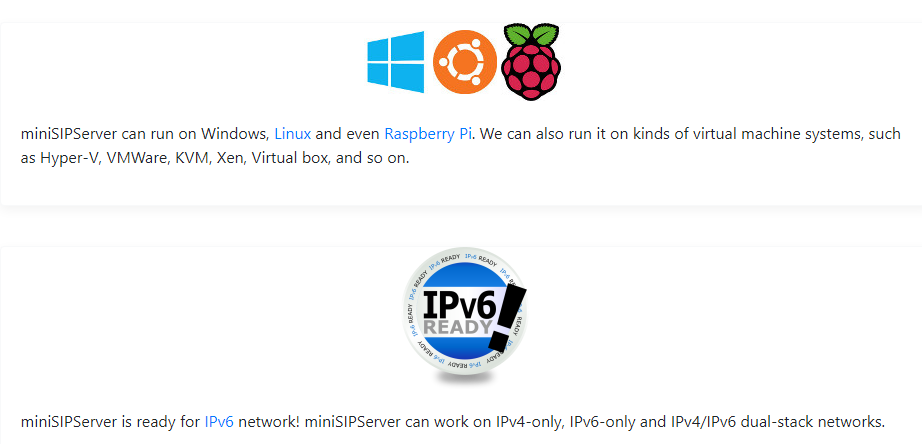 miniSIPServer might be the most easy-to-use VOIP(SIP) server. If you have no experience on VOIP systems, don't be afraid. You will be able to setup your own VOIP system in one hour. Please refer to our step by step document for more details. VoIP experts can find it is so easy to deploy enterprise communication services, such as ringing-group, follow-me, hunting-group, call queue, and so on. miniSIPServer can run on Windows, Linux and even Raspberry Pi. We can also run it on kinds of virtual machine systems, such as Hyper-V, VMWare, KVM, Xen, Virtual box, and so on. miniSIPServer is ready for IPv6 network! miniSIPServer can work on IPv4-only, IPv6-only and IPv4/IPv6 dual-stack networks. Lots of customers arround world have deployed miniSIPServer to establish VoIP networks, so why not take a try now? All versions are 30 days free trial without restrictions. Specially, we have a version for 5 clients, and it is FREE!