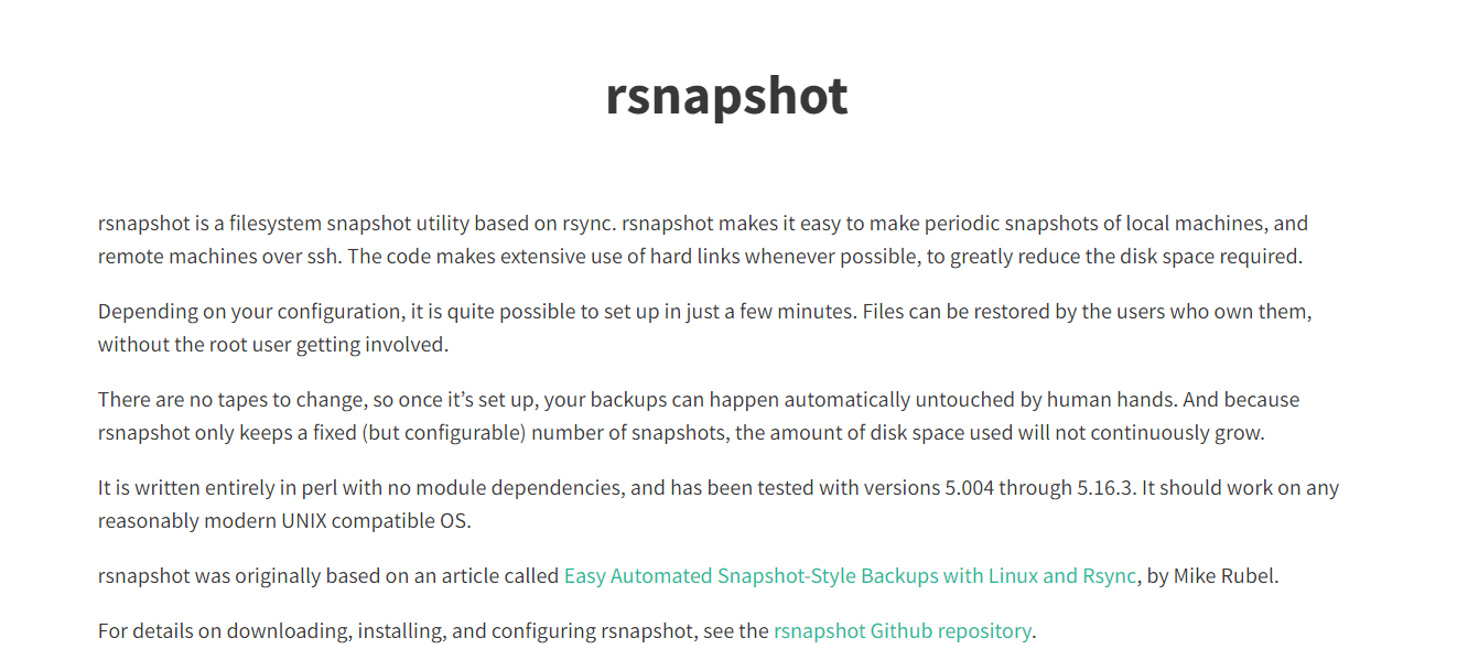 rsnapshot makes it easy to make periodic snapshots of local machines, and remote machines over ssh. The code makes extensive use of hard links whenever possible, to greatly reduce the disk space required. Depending on your configuration, it is quite possible to set up in just a few minutes. Files can be restored by the users who own them, without the root user getting involved. There are no tapes to change, so once it’s set up, your backups can happen automatically untouched by human hands. And because rsnapshot only keeps a fixed (but configurable) number of snapshots, the amount of disk space used will not continuously grow. It is written entirely in perl with no module dependencies and has been tested with versions 5.004 through 5.16.3. It should work on any reasonably modern UNIX compatible OS.