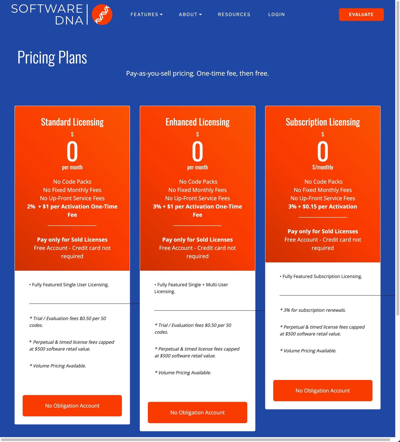 One-time license activation fee of $0.95 or less after your sale. Never pay anything else. Pay only when you sell your software. No monthly fees, no bandwidth fees, no code packs.